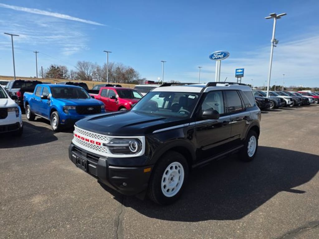 Osseo Ford is proud to offer this good-looking 2026 Ford Bronco Sport Heritage in Shadow Black, beautifully equipped with Convenience Package (Front Driver/Passenger Seat Back Map Pockets, Heated 8-Way Power Driver's Seat, LED Fog Lamps, and Premium Wrapped Steering Wheel), Equipment Group 250A Standard Package (AM/FM Stereo, Plaid Cloth Front Bucket Seats, SiriusXM with 360L, SYNC 4 with Enhanced Voice Recognition, and Wheels: 17" Oxford White-Painted Aluminum), Ford Connectivity Package (1-Year Included), Internet access capable: 5G Modem - Ford Connectivity Package, 4-Wheel Disc Brakes, 6 Speakers, ABS brakes, Air Conditioning, Alloy wheels, AM/FM radio: SiriusXM with 360L, Apple CarPlay/Android Auto, Auto High-beam Headlights, Automatic temperature control, Brake assist, Cargo Management System (Shelf/Divider/Table), Compass, Delay-off headlights, Driver door bin, Driver vanity mirror, Dual front impact airbags, Dual front side impact airbags, Electronic Stability Control, Emergency communication system: SYNC 4 911 Assist, Exterior Parking Camera Rear, Four wheel independent suspension, Front and Rear Floor Liners Without Carpet Mats, Front anti-roll bar, Front Bucket Seats, Front Center Armrest, Front License Plate Bracket, Front reading lights, Fully automatic headlights, Heated door mirrors, Illuminated entry, Knee airbag, Low tire pressure warning, Occupant sensing airbag, Outside temperature display, Overhead airbag, Overhead console, Panic alarm, Passenger door bin, Passenger vanity mirror, Power door mirrors, Power Moonroof, Power steering, Power windows, Radio data system, Rear anti-roll bar, Rear Parking Sensors, Rear reading lights, Rear seat center armrest, Rear window defroster, Rear window wiper, Remote keyless entry, Security system, Speed control, Speed-sensing steering, Speed-Sensitive Wipers, Split folding rear seat, Steering wheel mounted audio controls, Tachometer, Telescoping steering wheel, Tilt steering wheel, Traction control, Trip computer, and Variably intermittent wipers! Shadow Black 2026 Ford Bronco Sport Heritage 4WD 8-Speed Automatic 1.5L EcoBoost